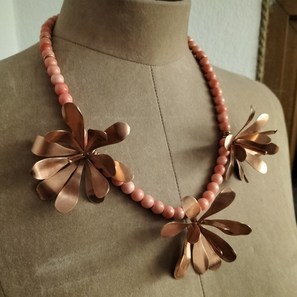 Clockwise, from top left: the contrast between sanded and not sanded copper, a handful of flower shapes, the first pairing of copper and pink porcelain beads, a statement necklace in the making.